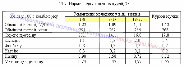 Норми годівлі ремонтного молодняку і курей-несучок представлені в таблиці 14.9. Раціони для яєчних курей складають з урахуванням змін потреби птахів в поживних речовинах, віку і продуктивності. Неповноцінна годівля ремонтних курочок, особливо у віці 17-18 тижнів, може негативно вплинути на розвиток органів яйцеутворення.