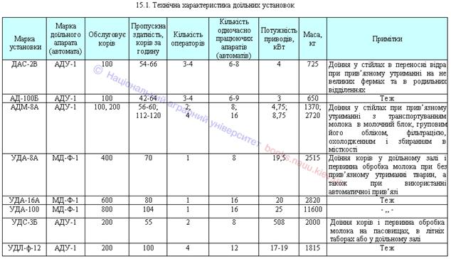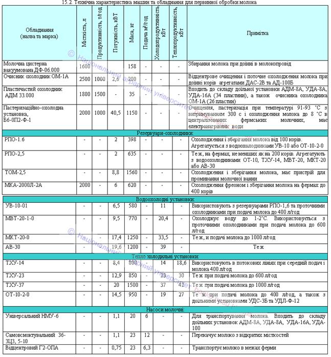 Технічна характеристика машин та обладнання для доїння корів і первинної обробки молока на фермах, а також рекомендації щодо їх раціонального використання наведені в таблицях 15.1 і 15.2.