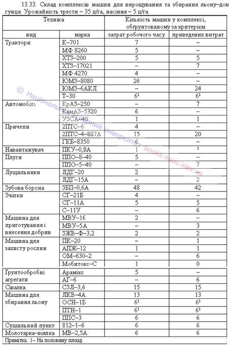 13.33. Склад комплексів машин для вирощування та збирання льону–довгунця. Урожайність трести — 35 ц/га, насіння — 5 ц/га