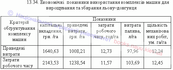 13.34. Економічні показники використання комплексів машин для вирощування та збирання льону–довгунця