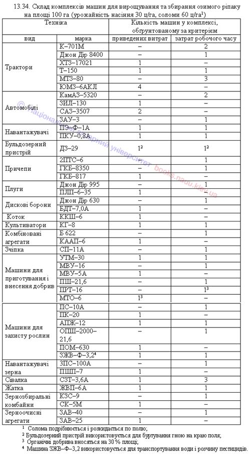13.34. Склад комплексів машин для вирощування та збирання озимого ріпаку на площі 100 га (урожайність насіння 30 ц/га, соломи 60 ц/га1)