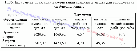 Економічні показники вирощування та збирання ріпаку вищенаведеними комплексами машин подано в таблиці 13.35.