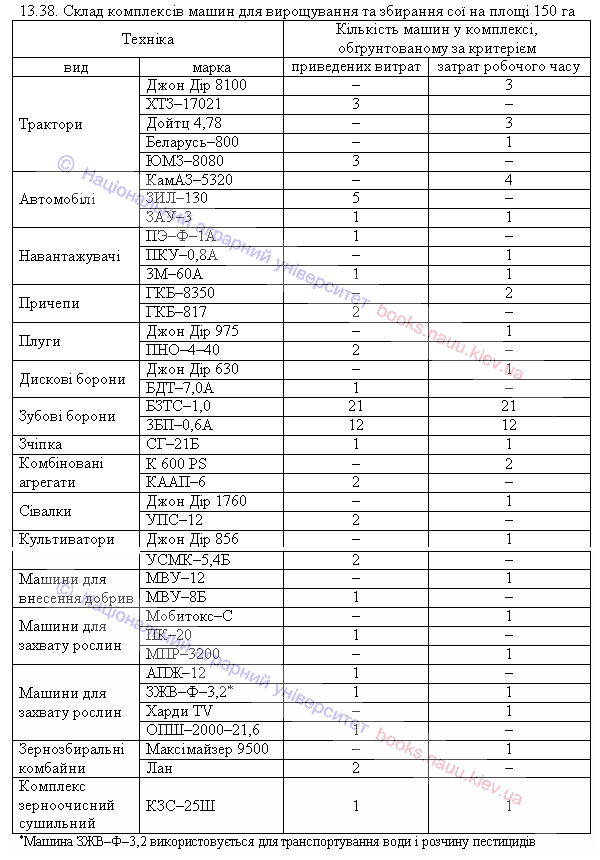 13.38. Склад комплексів машин для вирощування та збирання сої на площі 150 га