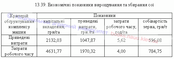 Економічні показники вирощування та збирання сої вищенаведеними комплексами машин подано в таблиці 13.39.