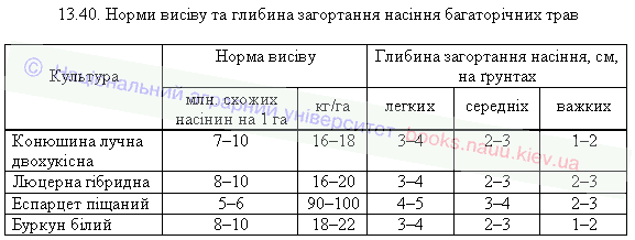 13.40. Норми висіву та глибина загортання насіння багаторічних трав