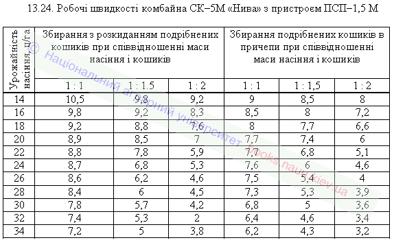 13.24. Робочі швидкості комбайна СК–5М «Нива» з пристроєм ПСП–1,5 М