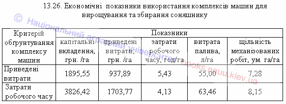 13.26. Економічні показники використання комплексів машин для вирощування та збирання соняшнику