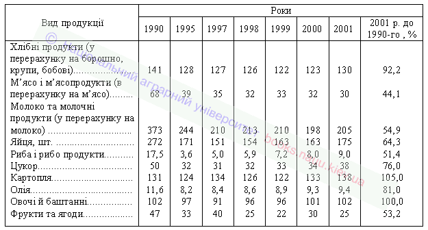 Україна була одним із найсприятливіших і найбільш розвинутих аграрних регіонів колишнього Радянського Союзу. На її частину припадало понад 7% сільськогосподарських угідь, а виробляла вона близько 24% зерна, 54 цукрового буряка, майже 34 льону і до 50% насіння соняшнику. Питома вага тваринницької продукції в загальному виробництві колишнього СРСР становила 22 24%. З розрахунку на душу населення тут вироблялося в окремі роки майже по тонні зерна, 300 320 кг картоплі, 450 470 кг молокопродуктів, 80 84 кг м’яса та 300 320 шт. яєць. Характерною особливістю сучасного етапу розвитку АПК є негативна тенденція скорочення виробництва основних видів продукції сільського господарства, в тому числі й рослинницького походження, що не може не вплинути на рівень їх споживання населенням країни (табл. 1.12.). Як видно з наведених у таблиці даних, порівняно з 1990 роком споживання хліба і хлібопродуктів зменшилося у 2001 році на 7,8 %; м’яса й м’ясопродуктів – 55,9; молокопродуктів – 45,1; яєць – 35,7; рибопродуктів – 48,6; цукру – 24; олії – 19; фруктів та ягід - на 46,8 %. Лише споживання картоплі зросло в незначній кількості (на 5 %).