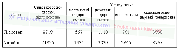 1.13. Структура земельних угідь Лісостепу України (господарства усіх категорій, станом на 1.01. 2002 р.) Щодо категорій господарств, то землекористування селянських (фермерських) господарств становить відповідно 656 тис. га, із них 638,9 тис. га сільськогосподарських угідь (97,4%); 598,2 тис. га ріллі (91,2%); 1,8 тис. га (0,27%) багаторічних насаджень; 39,6 тис. га (6,0%) сіножатей і пасовищ. У господарствах населення знаходиться 386 тис. га земельних угідь, із них 385,1 тис. га сільськогосподарських (23 %), 266 тис. га ріллі (19 %). У користуванні сільськогосподарських підприємств Лісостепу України в даний час зосереджено 89,2% сільськогосподарських угідь і 83,9% ріллі. В середньому на господарство припадає 1105 га сільськогосподарських угідь, у тому числі - 1038 га орної землі. Хоча ці господарства нині неоднозначно сприймаються щодо ефективності виробництва, проте їхньою вагомою перевагою є порівняно висока товарність, можливість і ефективність застосування передових механізованих технологій, які потребують значних обсягів аграрного виробництва , зокрема й рослинницької продукції. Формування і становлення аграрних підприємств в умовах ринкових відносин об’єктивно зумовлюють розвиток їхньої різноманітності, в основі якої знаходяться принципи рівних можливостей, конкуренції та дійового співробітництва господарств з різними формами власності. Кількість сільськогосподарських підприємств Лісостепу як землевласників і землекористувачів, що формувалися у недалекому минулому за концепцією посилення концентрації і поглиблення спеціалізації виробництва рослинницької та тваринницької продукції, налічує понад 8,7 тис., або близько 40 % їх загальної чисельності в країні (табл. 1.14.).