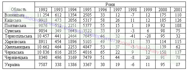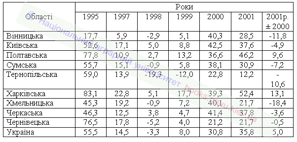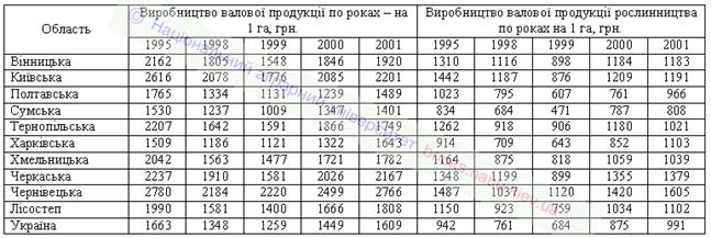 Наведені дані вказують, що використання сільськогосподарських угідь для виробництва рослинницької продукції останніми роками є прибутковим в аграрних підприємствах усіх областей Лісостепу. Найефективніше рослиництво у Черкаській, Київській та Вінницькій областях, тут у 2000–2001 роках одержано по 110–185 грн. прибутку з розрахунку на 1 га сільськогосподарських угідь. Недостатньо ефективне вирощування рослинницької продукції в Чернівецькій, Сумській, і особливо Тернопільській, областях, де аграрні підприємства одержали у 2001 році лише по 32 – 78 грн. прибутку. Щодо Сумської області, то тут передусім вплинули несприятливі погодні умови, тоді як у Чернівецькій та Тернопільській областях низька прибутковість, безумовно, свідчить про відсутність належної уваги до великотоварних форм аграрного виробництва.