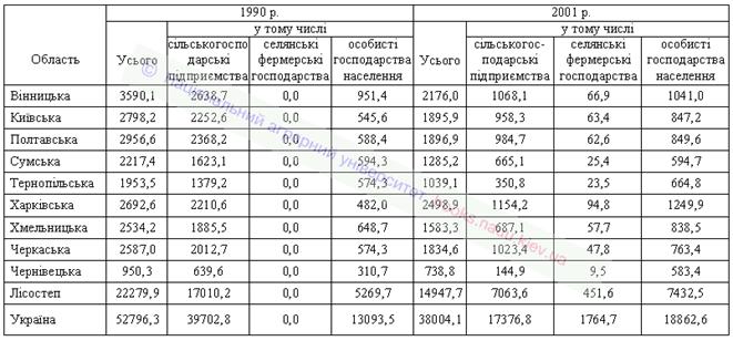 Таким чином, у зоні деяка перевага за вартістю вироблюваної рослинницької продукції належить дрібним господарствам, що не можна вважати прогресивним економічним явищем. Оскільки в особистих господарствах населення внаслідок їхніх малих розмірів відсутня можливість ефективного використання сучасних прогресивних технологій і високопродуктивної техніки, переважає в них ручна малокваліфікована праця. Потрібно відзначити, що промислове виробництво рослинницької продукції зберегло лідируючі позиції у Вінницькій, Київській, Полтавській, Сумській та Черкаській областях, тоді як у Тернопільській, і особливо Чернівецькій, областях провідне місце належить господарствам населення (відповідно 64 і 79 % вартості продукції рослинництва в області). Стосовно селянських (фермерських) господарств, то слід сказати, що їхня питома вага у виробництві рослинницької продукції становить лише 1,3 - 4 %. Отже, вони не мають істотного значення навіть у західних областях країни.