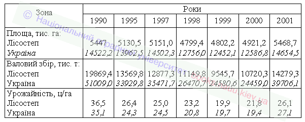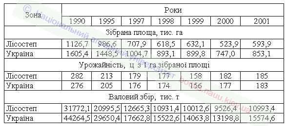 Як видно з даних таблиці 1.20., за останні 11 років у господарствах Лісостепу врожайність зернових знизилася. Це свідчить про те, що рівень ефективності використання земельних угідь в галузі зерновиробництва мав чітко виявлену тенденцію до зниження. Але в 2000 – 2001 роках ситуація дещо поліпшилася. Так, урожайність зернових у зоні зросла в 1,1 – 1,3 рази порівняно з 1999 роком.