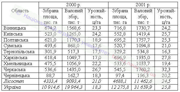 У сільськогосподарських підприємствах областей Лісостепу за останні два роки (2000 – 2001) посівні площі зернових збільшилися на 354,7 тис. га, або на 8,2%. Найвищий приріст площ був у Харківській області, яка за цим показником і врожайністю посідає друге місце в Лісостепу, але є першою за валовим збором зерна. Разом із тим, якщо зона Лісостепу в 2000 році переважала за продуктивністю загальнодержавний показник (відповідно врожайність становила 21 і 18,3 ц/га), то у 2001 році врожайність тут виявилася на 1,3 ц/га нижчою. Таким чином, хоча приріст урожайності зернових спостерігається у більшості областей зони (за винятком Сумської та Хмельницької областей, в яких зазначений показник знизився на 0,8 і 2,8 ц/га), але його темпи повільніші ніж у цілому по Україні. Це свідчить про нижчий рівень інтенсивності зернового господарства у Лісостепу порівняно зі Степовою зоною (оскільки степові області визначили вищі показники зерновиробництва в цілому по країні), в якій за аналізований період приріст показників зібраної площі й валового збору зерна становив, 17,8 і 107,3 % проти 8,2 та 20,6 % у середньому по лісостепових областях (табл. 1.21).