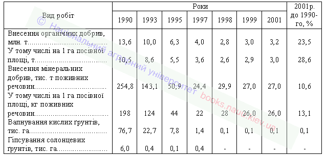 Так, обсяги проведення основних агрохімічних робіт із метою підвищення родючості ґрунтів у господарствах Київської області скоротилися порівняно з 1990 роком у 2001-му відповідно на 76,5, 89,4 і 99,9%, а гіпсування солонцевих ґрунтів останніми роками взагалі не проводиться. Головними причинами цього є різке зменшення бюджетних асигнувань, диспаритет цін, високий податковий тиск та інші фактори. Подібна ситуація і в інших областях зони Лісостепу.