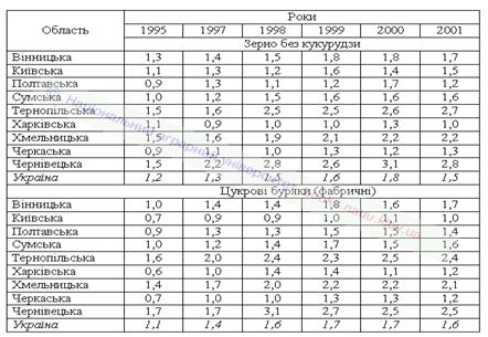 Аналіз даних таблиці 1.28 свідчить про те, що за період 1995 – 2001 роки хоча й проявлялися ознаки економічної кризи, але виробництво зерна практично в усіх областях зони Лісостепу було рентабельним, незважаючи на те, що собівартість одиниці продукції зросла у цей період від 3,66 (найнижчий показник в Лісостепу) до 25,42 грн. у Черкаській області й від 4,51 до 36,07 грн. (найвищий показник у зоні) в Тернопільській області.