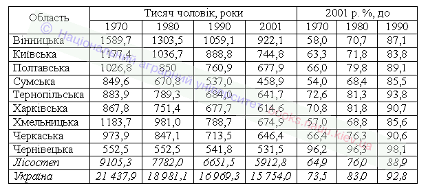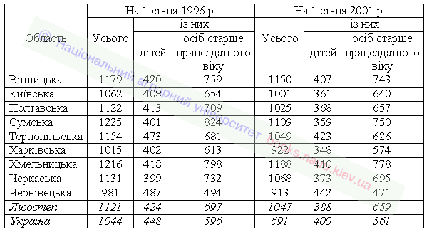 1.6. Динаміка чисельності сільського населення по областях Лісостепу (на початок року) Мігранти села – переважно люди активного віку, в основному молодь, у процесі відпливу виносять із сільськогосподарського та інших виробників АПК робочу силу й одночасно переносять із села в місто потенційну народжуваність, демографічний потенціал. Міграція населення із села в місто, як і міграція його з міста в село, природний процес. Але негативним у ньому є те, що велика частка мігрантів із села – людей молодого віку – призводить до порушення необхідного статево-вікового складу сільського населення та погіршення якісної характеристики робочої сили сільської місцевості. До того ж міграція сільського населення посилюється через незадовільні соціально-побутові умови життя у багатьох селах. Інтенсивний відплив сільської молоді через незадовільні умови трудової діяльності й проживання в сільській місцевості активізував негативні демографічні процеси. Зростає кількість розлучень, зменшується кількість – шлюбів та народження дітей у селах. Водночас смертність і старіння сільського населення набули небачених темпів. Зумовлена цим кризова демографічна ситуація звузила природну основу відтворення жителів села, спричинила погіршення їхніх якісних параметрів і зниження трудового потенціалу, особливо зайнятих в аграрній сфері. Аналіз свідчить, що абсолютне скорочення чисельності сільських жителів у Лісостепу відбувається, головним чином, внаслідок інтенсивного зменшення їхньої демографічної основи – дітей віком до 15 років. Протягом 1970 – 2001років кількість їх скоротилася більш, як на третину; на третину зменшилася кількість осіб працездатного віку, майже кожний третій житель села – пенсіонер за віком. Таким чином, структурно-динамічні зміни чисельності сільського населення досліджуваної зони відбуваються у двох протилежних напрямах: з одного боку, зменшується кількість дітей, підлітків та осіб працездатного віку, а з другого - зростає кількість пенсіонерів (табл.1.7.). Отже, сільське населення швидко старіє, звужується демографічна основа його відтворення. До того ж темпи цих динамічних змін набули стабільного, тенденційного характеру.