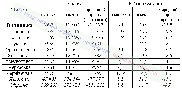 1.7. Демографічне навантаження сільського населення працездатного віку по областях Лісостепу (на 1000 чоловік працездатного віку припадає непрацездатних) Абсолютне скорочення чисельності сільського населення призводить до обезлюднення і руйнування поселенського потенціалу Лісостепу. Протягом 90–х років лише в Харківській області призупинили своє існування понад 90 сільських населених пунктів. Основною складовою економічної кризи у сільській місцевості Лісостепу є різке зниження народжуваності. За 1990 – 2001роки абсолютна кількість народжених зменшилася на 47 тис. чоловік, або на 36%. Основна причина зниження народжуваності до рівня, який не забезпечує навіть простого відтворення сільського населення, полягає в тому, що задоволення тут потреби у дітях, материнстві та батьківстві конкурує з низкою інших потреб, тим елементарніших, чим нижчий рівень життя. Якщо врахувати, що кожний третій селянин знаходиться за межею бідності, працівники аграрної сфери одержують заробітну плату, нижчу від прожиткового мінімуму, і сучасний рівень існування селян зведений до елементарного виживання, ситуацію з народжуваністю в сільській місцевості можна розглядати як кризову. Економічні причини зниження народжуваності селян криються у виробничій сфері, насамперед у сфері праці. Та частина національного доходу, яка використовується на особисте споживання, навіть у некризових умовах не відшкодовувала необхідних витрат сім’ї на утримання не тільки третьої, але й навіть другої дитини. Тому сім’я з дітьми економічно не забезпечувалася, рівень життя її був нижчим, від соціально необхідного. За роки соціально-економічної кризи ситуація погіршилася, на що селянство відреагувало інтенсивним зниженням народжуваності. В умовах різкого зниження народжуваності сільського населення, посилення його старіння прогресує показник смертності. Коефіцієнт смертності (кількість померлих на 1000 селян ) зріс за 1990 – 2001 роки від 17,3 до 21,1. Абсолютна і відносна кількість померлих перевищує відповідні показники народжень, тому природний приріст сільського населення має від’ємне значення. В 2001 році чисельність померлих у селах Лісостепу на 77 тис. чоловік, а України на 156,4 тис. чоловік перевищувала кількість народжених (табл. 1.8).
