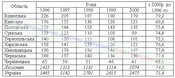 1.9. Динаміка середньорічної кількості працівників сільськогосподарських підприємств Лісостепу, тис. чоловік Попит на робочу силу в сільському господарстві, зокрема, на молодь, зменшується. Це пов’язано переважно з відсутністю належної молодіжної політики щодо сприяння зайнятості, яка має бути зорієнтована на працевлаштування молоді у сільському господарстві, збереження наявних і розвиток нових робочих місць. Таким чином, у сільській місцевості спостерігаються досить негативні зміни в перерозподілі працюючого населення по галузях економіки, зменшення його частки у сільському господарстві й переміщення в інші галузі народного господарства. Загальними проявами цих процесів є абсолютне і відносне скорочення чисельності зайнятих осіб як у цілому по галузях економіки, так і в аграрному секторі, зниження мобільності щодо підвищення ефективності функціонування сільськогосподарських підприємств, зростання кількості працюючих у приватному неформальному секторі, мотивами якого є в основному пошук шляхів подолання безробіття, а не створення альтернативних виробництв сільськогосподарського виробництва. Для усунення наслідків негативних структурних змін щодо зайнятості та докорінного її поліпшення доцільно проводити активну політику соціального захисту сільських жителів, яка має ґрунтуватися на науково опрацьованих принципах з урахуванням територіальних особливостей. При цьому першочергову увагу слід приділяти формуванню та функціонуванню ринку робочої сили за рахунок розвитку підприємництва, малого і середнього бізнесу, вдосконалення мотиваційного механізму щодо раціонального використання робочої сили, максимально використавши при цьому такі риси селянина, як ініціативність, підприємливість, активність, свідомість, що особливо притаманні молоді. Для здійснення будь-якого виробничого процесу необхідні засоби виробництва. Вони створюють виробничо-технічний потенціал галузі, що визначається сукупністю матеріально-речових елементів виробництва, які за певних умов забезпечують можливість виконання всього циклу технологічних операцій для одержання сільськогосподарської продукції. Важливими показниками рівня оснащеності господарств основними засобами є фондозабезпеченість та фондоозброєність праці. Аналіз свідчить про стійку тенденцію зниження фондозабезпеченості (з розрахунку на 1 га сільськогосподарських угідь) у діючій грошовій одиниці і досить рельєфно в умовній грошовій одиниці (табл.1.10.). Якщо в 1996 році на 1 га сільськогосподарських угідь у сільськогосподарських підприємствах Лісостепу припадало 2550 умовних одиниць галузевих основних засобів, то в 2001-му – 536, тобто фондозабезпеченість за п’ять років знизилася у 4,8 рази.