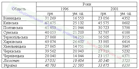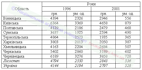 Фондоозброєність одного середньорічного працівника за останні п’ять років також істотно знизилася (табл.1.11.). Якщо в 1996 році на середньорічного працівника припадало 37 тис. грн., а у 2001-му – 30,3 тис. грн. вартості основних засобів, то зовсім інша картина постає при зіставленні цих показників в умовних грошових одиницях: у 1996 році - 19,6 тис. умовних одиниць, а в 2001-му – 5,7 тис. умовних одиниць на середньорічного працівника. Таким чином, фондоозброєність праці у сільськогосподарських підприємствах Лісостепу знизилася за п’ять років у 3, 4 рази.