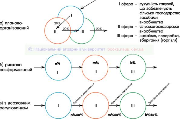На нашу думку, взаємовідносини між сферами АПВ великою мірою визначаються типом економічної системи, яка існує в державі (рис. 1.1). Так, у планово–організованій системі рентабельність виробництва продукції кожної із сфер визначається на основі витрат виробництва та державних закупівельних цін, в даному випадку вона становить 20%. При ринково несформованій економіці прибуток, одержаний у кожній із сфер, може значно варіювати, оскільки формується під впливом попиту й пропозиції, проте деякі вітчизняні виробники, наприклад сільськогосподарської техніки, є монополістами на ринку. Так, у І сфері внаслідок відсутності конкуренції може одержуватися прибуток n%, ІІ – m% і в ІІІ – відповідно k%. За умови існування державного регулювання аграрного виробництва держава має вплив на економічну діяльність суб’єктів підприємництва у всіх трьох сферах, у нашому прикладі цей вплив зумовлює регулювання прибутку в кожній із сфер на х% з метою забезпечення насамперед інтересів споживачів.