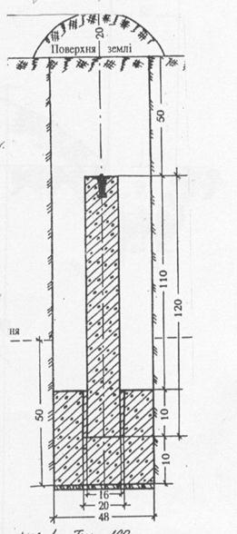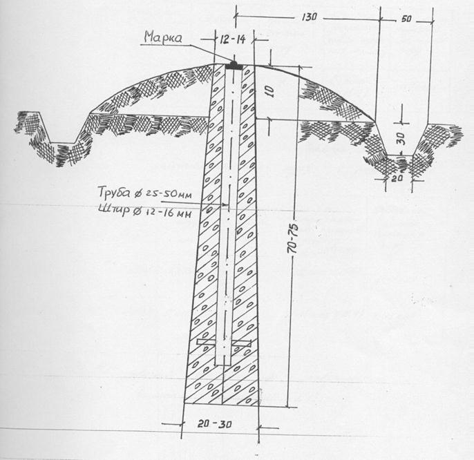 Цей центр складається із залізобетонного пілота у формі паралелепіпеда з поперечним розрізом 16 х16, довжиною 120 см з маркою у верхній площині і бетонної плити (якоря) діаметром 48-50 см, висотою 40 см. В середині бетонної плити роблять отвір 20х20х10 см, у який встановлюють залізобетонний пілон. Ґрунтовий репер закладають у свердловину глибиною 180 см і діаметром 50 см. Якір з пілоном повинен скріплюватися цементним розчином. На дно свердловини також укладають шар цементного розчину товщиною не менше 3 см. Марка ґрунтового репера повинна розташовуватись від поверхні землі на глибині 50 см. При виході скелі на глибину до 70 см в неї закладають марку на цементному розчині.
