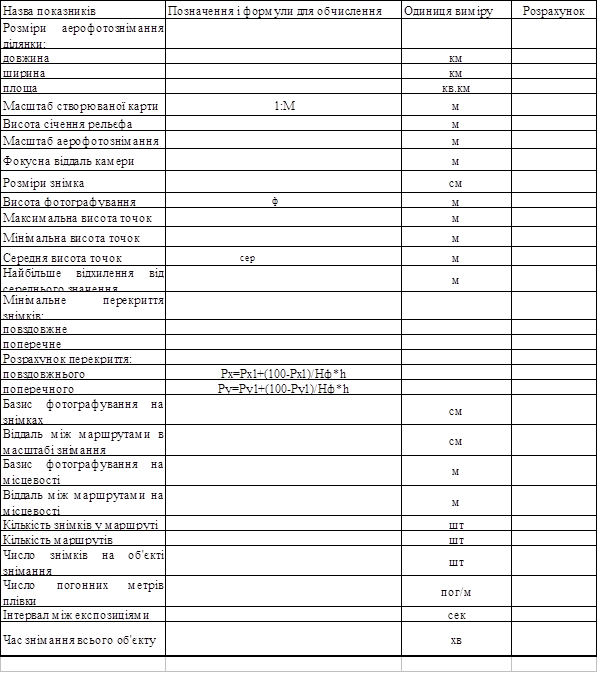 Розрахунок основних даних виконується з метою складання технічного завдання на виконання аерофотознімання. Вибір масштабу фотографування, фокусної віддалі АФА, типу приладу для обробки, встановлення мінімального повздовжнього та поперечного перекриття знімків здійснюється згідно “ Інструкцією “[1] пп. 7.1.6-7.1.8, в залежності від масштабу створюваної карти, характеру рельєфу, забудови території та інше.