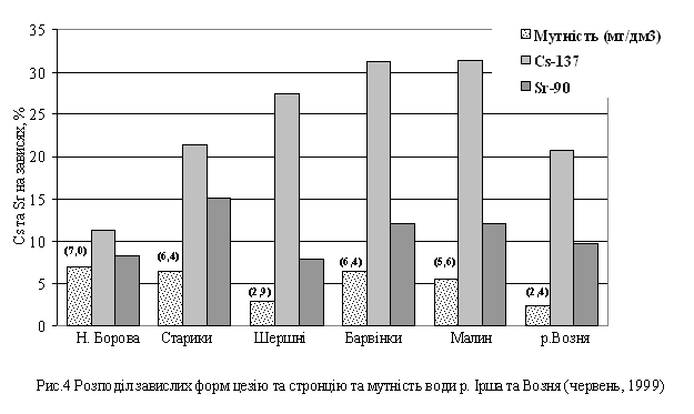 Нами були визначені величини мутності води річок Ірша та Возня у точках відбору проб та проаналізований вміст радіонуклідів у зваженій речовині. Дані наведені на рис. 4 відображають мутність води досліджених річок та частку завислих форм радіонуклідів, розраховану в процентах від їх загального вмісту. Було встановлено що частка завислих форм цезію у воді досліджених річок становила близько 27% для р. Ірша та 21% для р. Возня. Для стронцію частка його завислих форм становила близько 10-11% як для р. Ірша, так і для р. Возня. Слід також підкреслити добре помітне підвищення частки завислих форм цезію у нижній течії р. Ірша на ділянці Шершні-