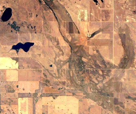 У тому, що явище утворення долин дренажних потоків не є чимось унікальним, а закономірним на етапі післяльодовикового розвитку, можна переконатися повернувшись до рис. 20 - 30. На рис.51 наведений дуже яскравий приклад зображення дренажного потоку, що розтинає поверхню моренної рівнини. Знімок відноситься до сучасного басейну річки Current Swift. Чіткість елементів долини потоку свідчить про швидке та одноактове формування долини. Звертає увагу на себе плямистість зображення у південній частині знімка. З протилежного берега озера розташована індіанська резервація (White Bear). На фрагменті топокарти (рис.45) вона обведена темним квадратом у східній частині ділянки.