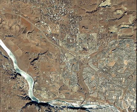 Рис.53. Сучасний вигляд долини річки Elbow в межах західної околиці міста Калгарі (http://www.spaceimaging.com/gazette/) |