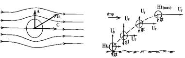 де 0,6 - аеродинамічний коефіцієнт. Проведені за цими формулами розрахунки сил лобового опору дають високу подібність значень. Але, враховуючи те, що частіш уживаною є формула Стокса (2.9.), вона була прийнята за основу. Під час руху піщинки в повітряному потоці, в залежності від співвідношення швидкостей вітру і руху піщинки, можлива різнонаправлена дія аеродинамічних сил - прискорююча в випадку, коли швидкість вітру більша, ніж швидкість польоту піщинки і гальмуюча, при зворотному співвідношенні
