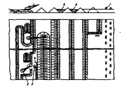 1 - розкривний екскаватор, 2 - видобувний екскаватор, 3 - землесос, 4 пдромонітор; 5 - ставок-відстійник зворотної води, 6 хвостосховище; 7 лісопосадки на рекультивованих ділянках (за А.К. Поліщуком, 1977).