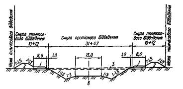 а) - у насипі від 3 до 6 м; б) - у насипі від 6 до 12 м; в) - у виїмці; 1 -тимчасові проїзди; 2 - відвали родючого грунту; 3 - шар грунту, який згортається (за В.П. Старовойдою і П.П Дзюбою, 1987).