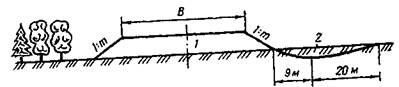 1 - насип; 2 - резерв; 1:т - закладання укосів; В - ширина земельного полотна.