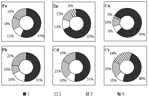 Дані про розподіл металів серед комплексних сполук з РОР, що мають різну молекулярну масу, підтверджують виключно важливу роль ГР у їх зв`язуванні (рис. 4). Основна частка зв’язаних металів – від 48,5 до 79,6 % – сконцентрована у фракції з найменшою молекулярною масою. Якщо врахувати, що молекулярна маса переважної частини ФК у водосховищах Дніпра не перевищує 1000 Да, то цілком вірогідно, що саме ця фракція ФК зв’язує метали найбільше.