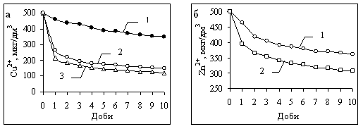 Рис. 5. Кінетика комплексоутворення Cu (II) та Zn (II) у воді верхньої ділянки Канівського водосховища. а: 1 – червень, 2 – серпень, 3 – листопад; б: 1 – квітень, 2 – жовтень.