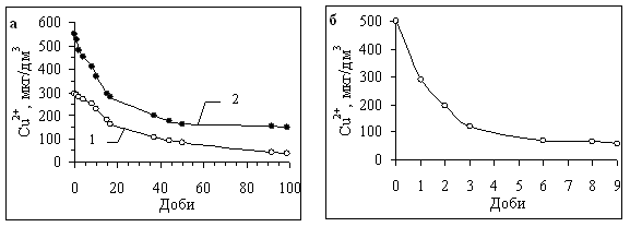 Рис. 6. Зміна концентрації вільних іонів Cu (ІІ) у воді з верхньої ділянки Канівського водосховища в червні 1998 р. (а) та в пробах на основі бідистильованої води з фракцією ФК 800–400 Да (б) внаслідок комплексоутворення. а: початкова концентрація іонів Cu (ІІ) у воді 250 (1) та 500 (2) мкг/дм3, рН=8,1; б: рН=8,0; Сорг= 27,0 мг/дм3, [Cu2+]=500 мкг/дм3.