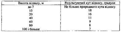 Під час проектування відвалів рекомендується приймати такі максимальні значення результуючого кута відкосу.