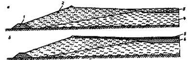 Розробка родовищ корисних копалин за допомогою гідромеханізації вважається одним із прогресивних способів. На відміну від насипних відвалів, гідровідвал має рівну поверхню з незначним ухилом до відстійника. Відкоси І ідровідвалу порівняно пологі (від 1:3 до 1:5). Схема гідровідвалу показана на рис. 3.14.