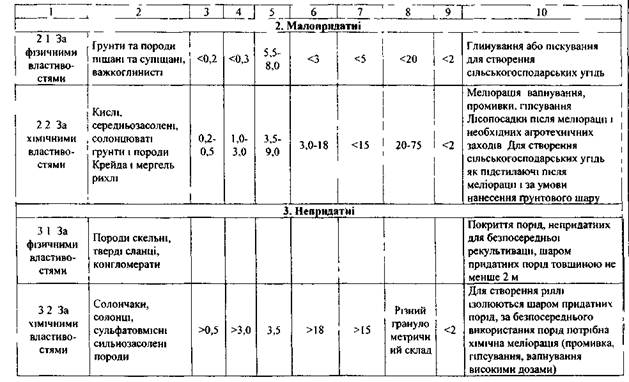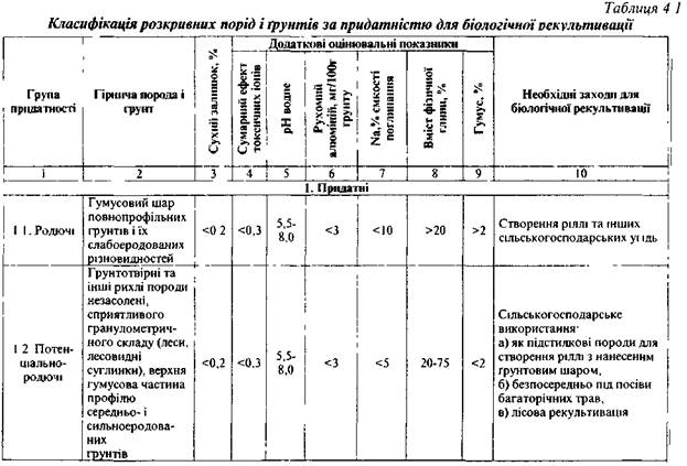 Враховуючи це, запропоновано декілька класифікацій придатності розкривних порід і ґрунтів для біологічної рекультивації. Найбільш поширеною є класифікація, яка подана у таблиці 4.1.
