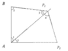 Розглянемо рис. 2.46. Нехай на місцевості зафіксовані дві точки А і В. З рисунку видно, що визначення положення Р1 достатньо виміряти два кути 1 і 2. відклавши величини цих кутів в пересіченні напрямків із пунктів А і В, знайдемо положення пункту Р1. Вимір кута 3 в пункті Р1 буде надлишковим і це призводить до виникнення умови фігури. Для знаходження наступної точки, Р2 необхідно виміряти два кути (4, 5) в пунктах А і Р1. За методом, наведеним вище, отримаємо положення пункту Р2.