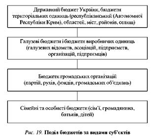 За видами суб'єктів розрізняють бюджет державний і бюджети його територіальних частин, галузевих, виробничих одиниць, бюджети громадських організацій, бюджети сімейні та особисті (рис. 19).
