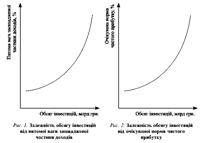В умовах низьких середньодушових доходів основна їх частина витрачається на споживання. Зі збільшенням доходів збільшується їх частина, спрямована на заощадження. Вона і є джерелом внутрішніх інвестиційних ресурсів. Залежність обсягу інвестицій від питомої ваги заощадженої частини доходів показана на рис. 1.