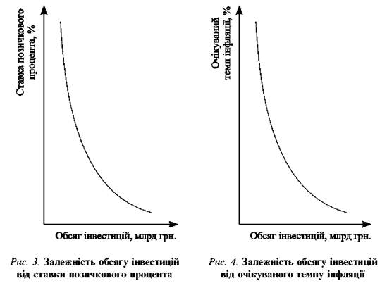 На обсяг інвестицій істотно впливає й ставка позичкового процента, оскільки у процесі інвестування використовується як власний, так і позичковий капітал. Якщо очікувана норма чистого прибутку перевищує ставку позичкового процента, то за інших рівних умов інвестування буде ефективним. Зі збільшенням ставки позичкового процента обсяг інвестицій зменшується, і навпаки (рис. 3).