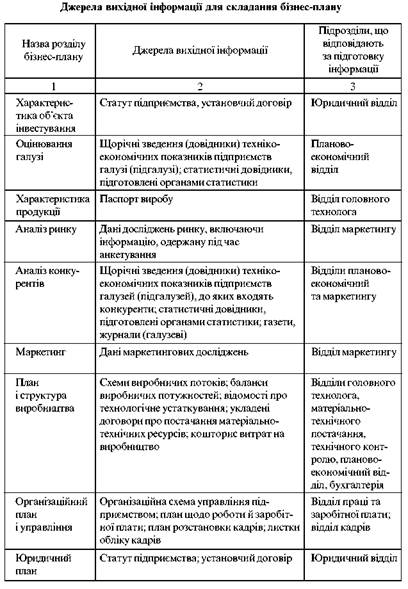 Розробка бізнес-плану пов'язана з використанням великої кількості інформації. Повнота і якість її істотно впливають на можливість досягнення мети, поставленої під час складання бізнес-плану. Недостатнє висвітлення окремих його розділів через обмеженість інформації може викликати в інвесторів сумніви щодо доцільності виділення коштів. Тому важливо знати, які дані потрібні для складання бізнес-плану і де їх можна знайти.