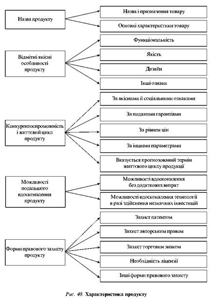 У цьому розділі наводяться загальна технологічна оцінка продукції (робіт, послуг), її функціональні характеристики (у разі потреби вони підтверджуються кресленнями, фотографіями), аналіз конкурентоспроможності й життєвого циклу, ступінь і форми правової захищеності. Структуру цього розділу доцільно будувати за схемою, наведеною на рис. 40.