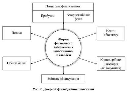 Найістотнішим фактором інвестиційної діяльності є наявність фінансових ресурсів. Це перша умова формування інвестиційних планів і водночас основне обмеження. З оцінювання обсягів наявних ресурсів починається інвестиційне планування, і за цими ресурсами перевіряється реальність уже розробленої інвестиційної стратегії. На рис. 9 показано можливі джерела фінансування інвестицій.