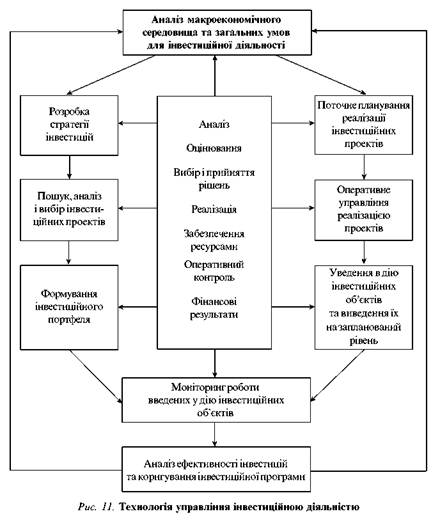 Здійснення інвестиційної діяльності передбачає відповідне управління цим процесом: прийняття рішень щодо забезпечення ресурсами, їх раціонального використання, а також техніки та технології виробництва, проблем якості, цін і збуту, досягнення запланованого кінцевого фінансового результату.