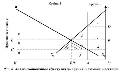 З іншого боку, приплив капіталу з країни 1 у країну 2 призвів до зниження прибутковості вкладення капіталу в ній із K'D до K'F—BR. Однак водночас за рахунок інвестування як свого капіталу, так і іноземного, що прийшов із країни 1, у країні 2 збільшився обсяг внутрішнього виробництва з i+j + k до i+j + k+g+h+e +/.