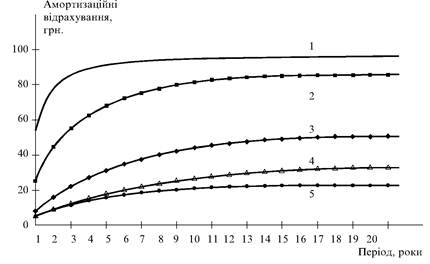 Рис. 2. Рівень накопичення амортизаційних відрахувань згідно з чинними нормами податкового та бухгалтерського обліку з урахуванням структури основних засобів підприємств за методами: 1 — прискореного спадного залишку; 2 — спадного залишку; 3 — кумулятивний; 4 — лінійний; 5 — податковий