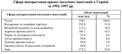 Сфери використання іноземних інвестицій в Україні та перелік країн-донорів наведено у табл. 4 і 5. У 1995 p. в Україні зареєстрова-но 2828 іноземних інвестицій на суму 1068,7 млн дол., а в 1994 p. — 3042 інвестиції на суму 744 млн дол. За даними Комісії ООН з транснаціональних корпорацій, найбільша частка прямих інвестицій у сфері послуг припадає на фінансову діяльність, страхування та тор-гівлю.